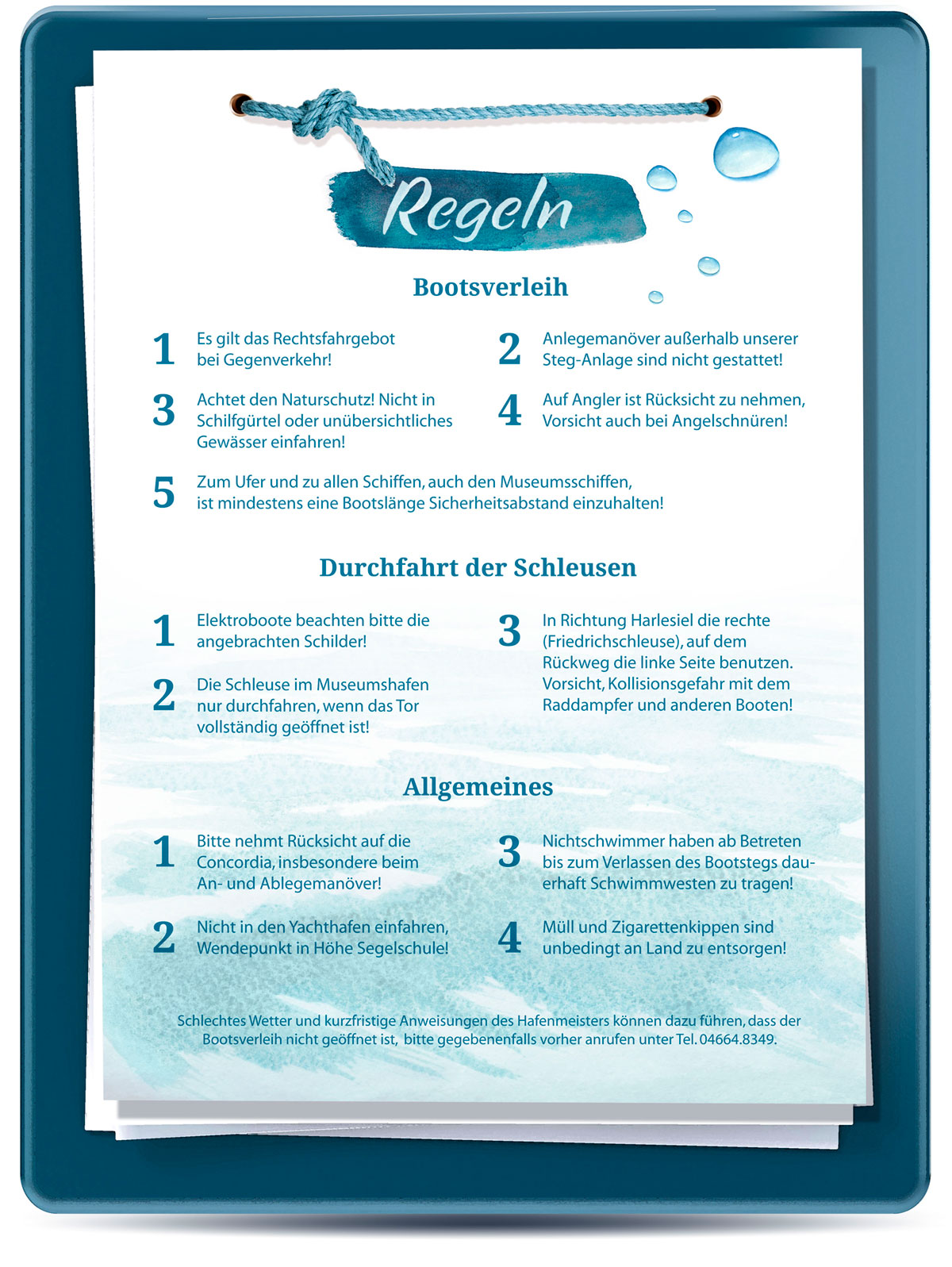 Schlechtes Wetter, starke Strömung, Personalausfall oder kurzfristige Anweisungen des Hafenmeisters können dazu führen, dass der Verleih geschlossen bleibt.